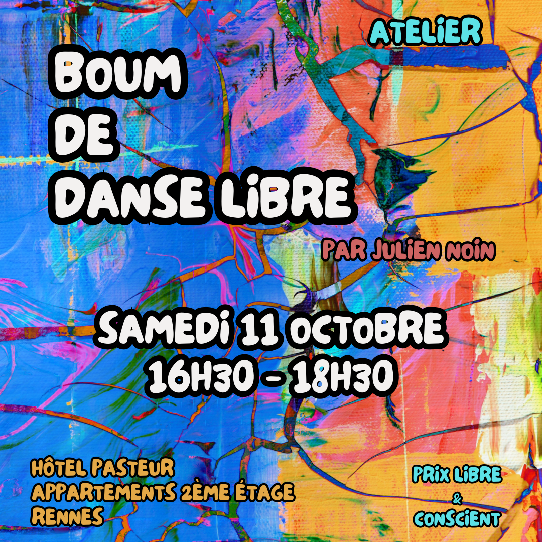 Prochain Atelier Boum de Danse Libre : Samedi 11 Octobre 2025, de 16h30 à 18h30, aux "Appartements" de l'Hôtel Pasteur, 2ème étage (proche du Studio), à Rennes.